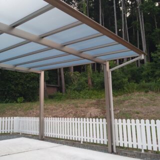 明るい日差しが似合う、アメリカンフェンスと木調カーポートのあるお庭が完成しました。