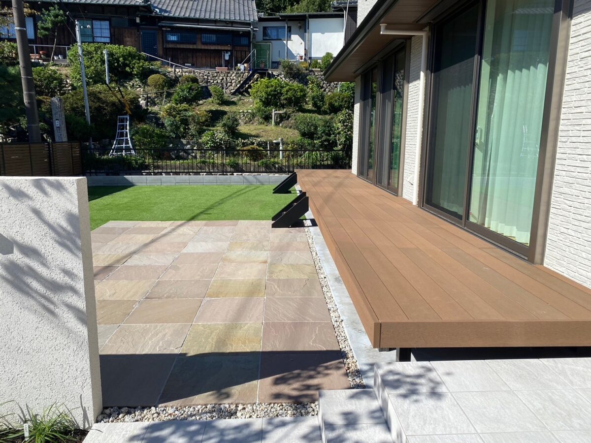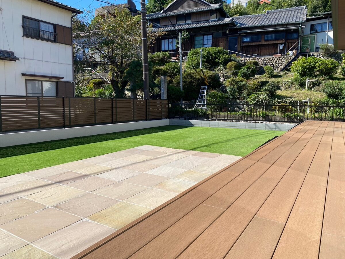 今回の施工では、お客様のご要望であった「家族で楽しめる庭」をテーマにプランニングしました。特に、メンテナンスの手間が少ない人工木デッキと人工芝をご提案することで、ご家族が気軽に庭に出て、リラックスできる空間を目指しました。アプローチには乱形石と平板、木調フェンスを組み合わせることで、温かみのあるモダンなエクステリアが実現。お客様に喜んでいただけて、大変嬉しく思います。