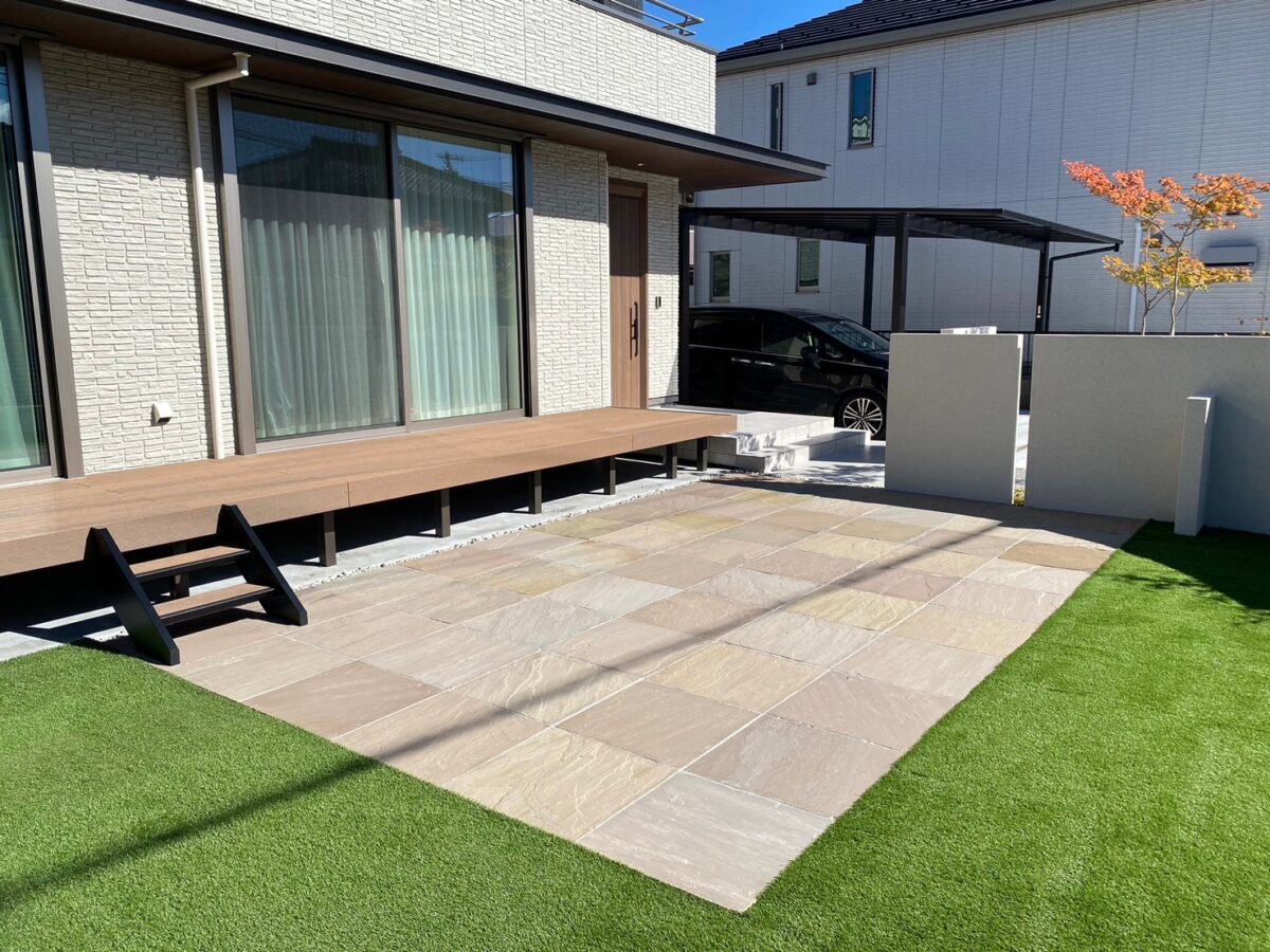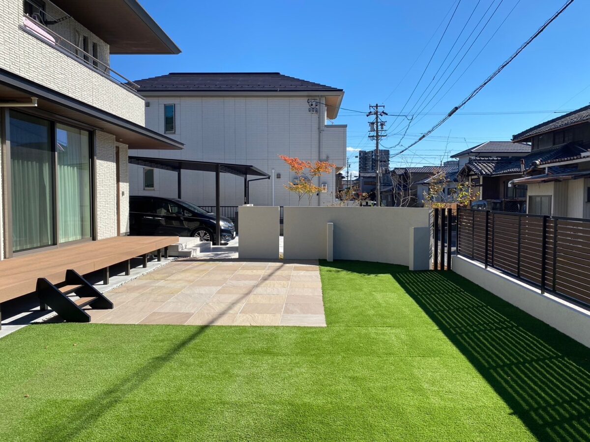 「アプローチの石と木調のフェンスが、想像以上に家の雰囲気に合っていて、とても気に入っています。人工芝とデッキのおかげで、子どもたちも思いっきり遊べるようになり、家族で過ごす時間が増えました。素敵な庭を本当にありがとうございます。」