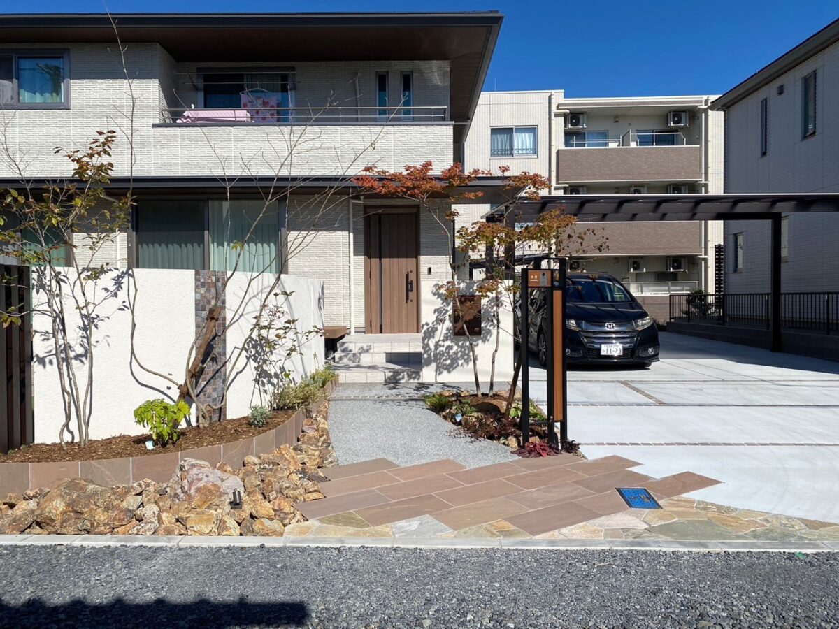 アプローチには、表情豊かな乱形石貼りと平板敷きを組み合わせました。異なる素材を効果的に配置することで、単調になりがちな足元にデザインのアクセントを加えています。駐車スペースには、建物の雰囲気に合わせたシャープなデザインの2台用カーポートを設置。雨の日も快適に乗り降りできます。