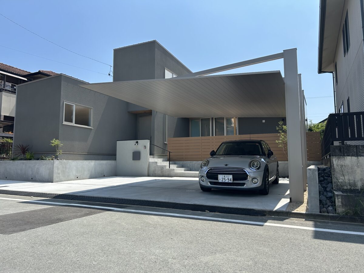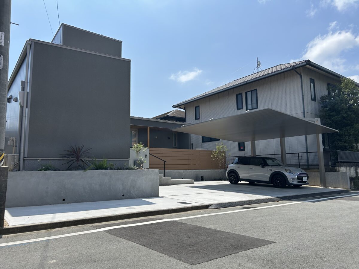 駐車スペースの上部には、**LIXILのカーポートSC片支持タイプ(2台用)**を設置しました。柱が片側にしかないため、車の出し入れが非常にスムーズです。また、屋根の薄型デザインが、圧迫感を感じさせず、エクステリア全体をスタイリッシュに引き立てます。