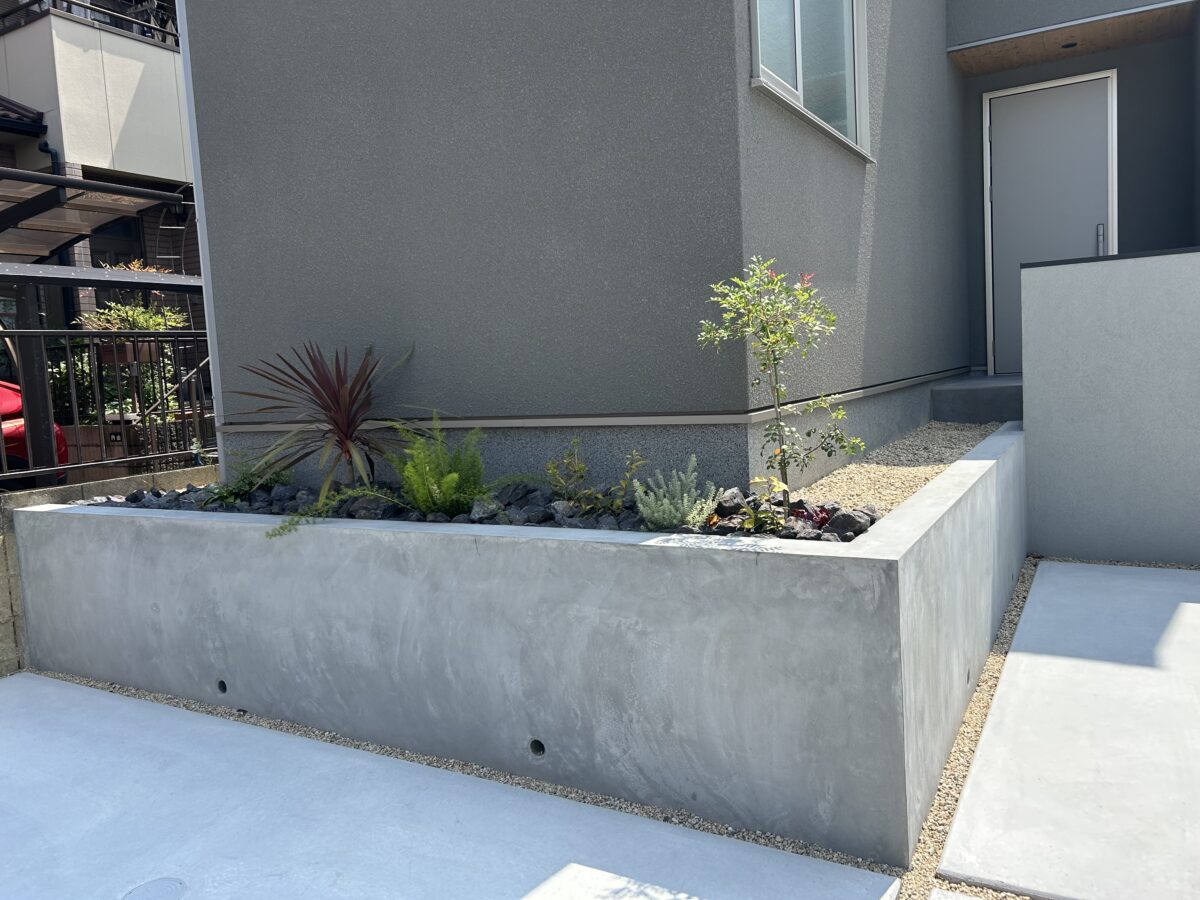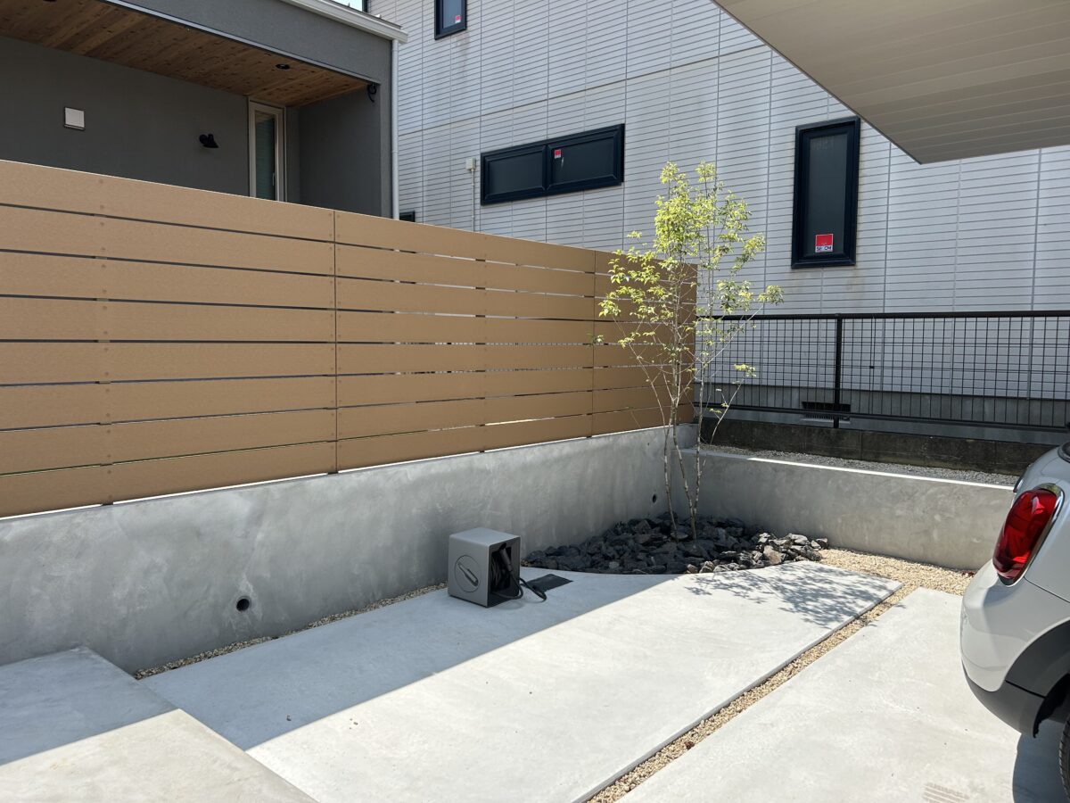 今回は、建物のシンプルでモダンな雰囲気に合わせた、機能性とデザイン性を両立させたエクステリアを施工しました。お客様のライフスタイルを考慮し、すっきりと洗練された空間を創り上げています。