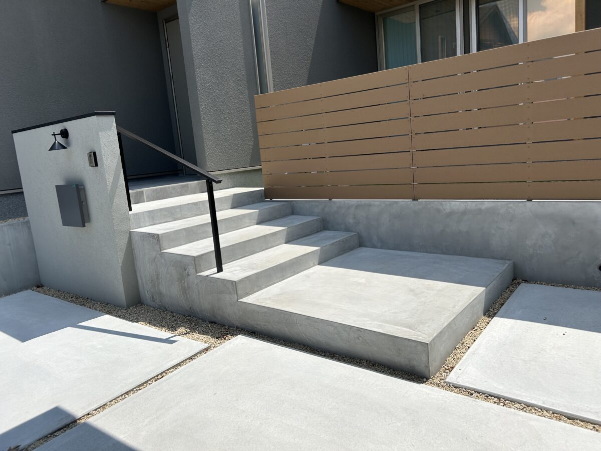 広々とした駐車スペースには、フラットな土間コンクリートを打設しました。滑らかで均一な仕上がりが、全体にクリーンな印象を与えます。玄関へと続く階段はモルタル階段で造作し、シャープな建物デザインに柔らかさをプラスしました。