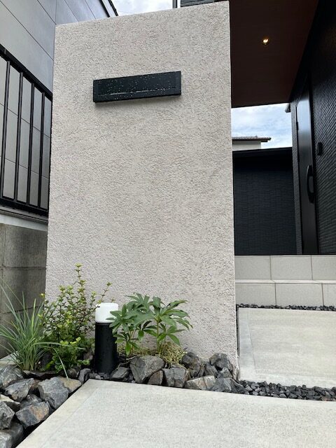 玄関横には、家の顔となる塗り壁門柱を設置しました。あえてシンプルに仕上げることで、建物全体のデザインと調和しながらも、確かな存在感を放ちます。埋め込み式のポストと照明を組み合わせ、機能性と美しさを両立させました。
