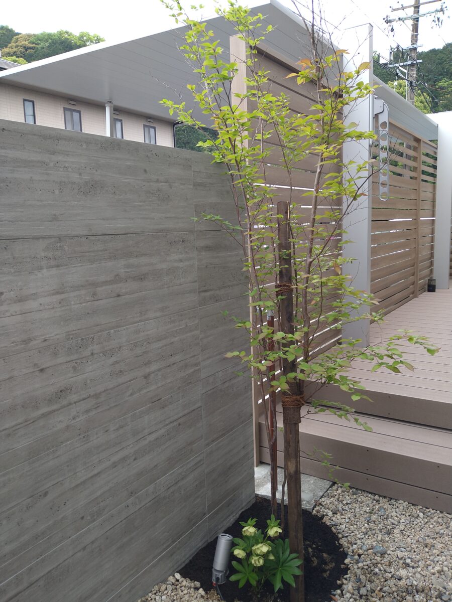建物全体のトーンに合わせたブラウン系の木目と、コンクリート調のモダンな素材を組み合わせることで、統一感のあるデザインを実現。機能性と美しさ、そして快適なプライベート空間を両立した、永く愛せるエクステリア空間となりました。