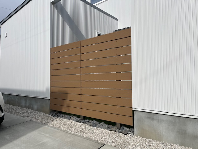 外からの視線をやまらかく遮る、木調の目隠しフェンス。