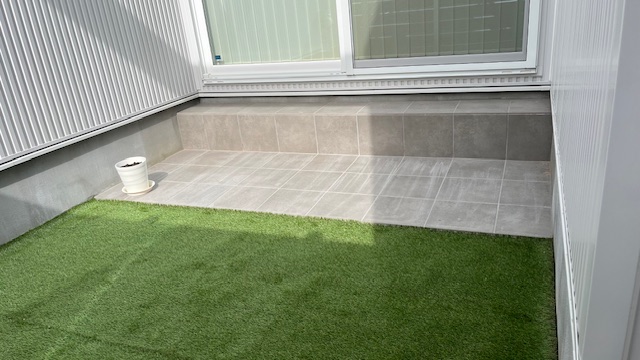目隠しフェンスの内側は、人工芝とタイルデッキでくつろげるお庭に。