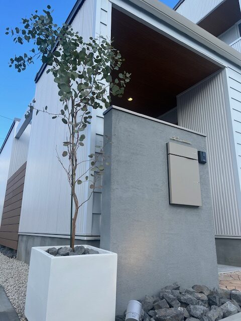 やさしいグレーの門柱に、やわらかな葉のシンボルツリーを添えました。