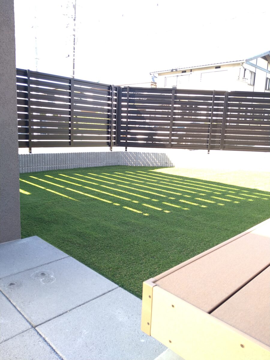プライベートなお庭空間には、一年中鮮やかな緑が続く人工芝を敷き詰めました。メンテナンスフリーで、お子様やペットが安心して遊べるクッション性の高い空間となっています。その周囲を囲うのは、温かみのある木調目隠しフェンスです。アルミ素材の耐久性と天然木のような質感を兼ね備え、通りからの視線を優しく遮りながら、家族だけの落ち着いた時間を守ります。