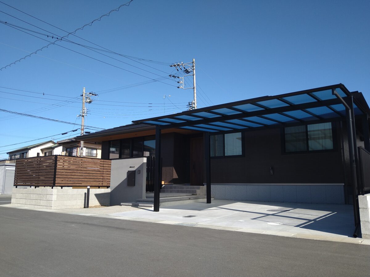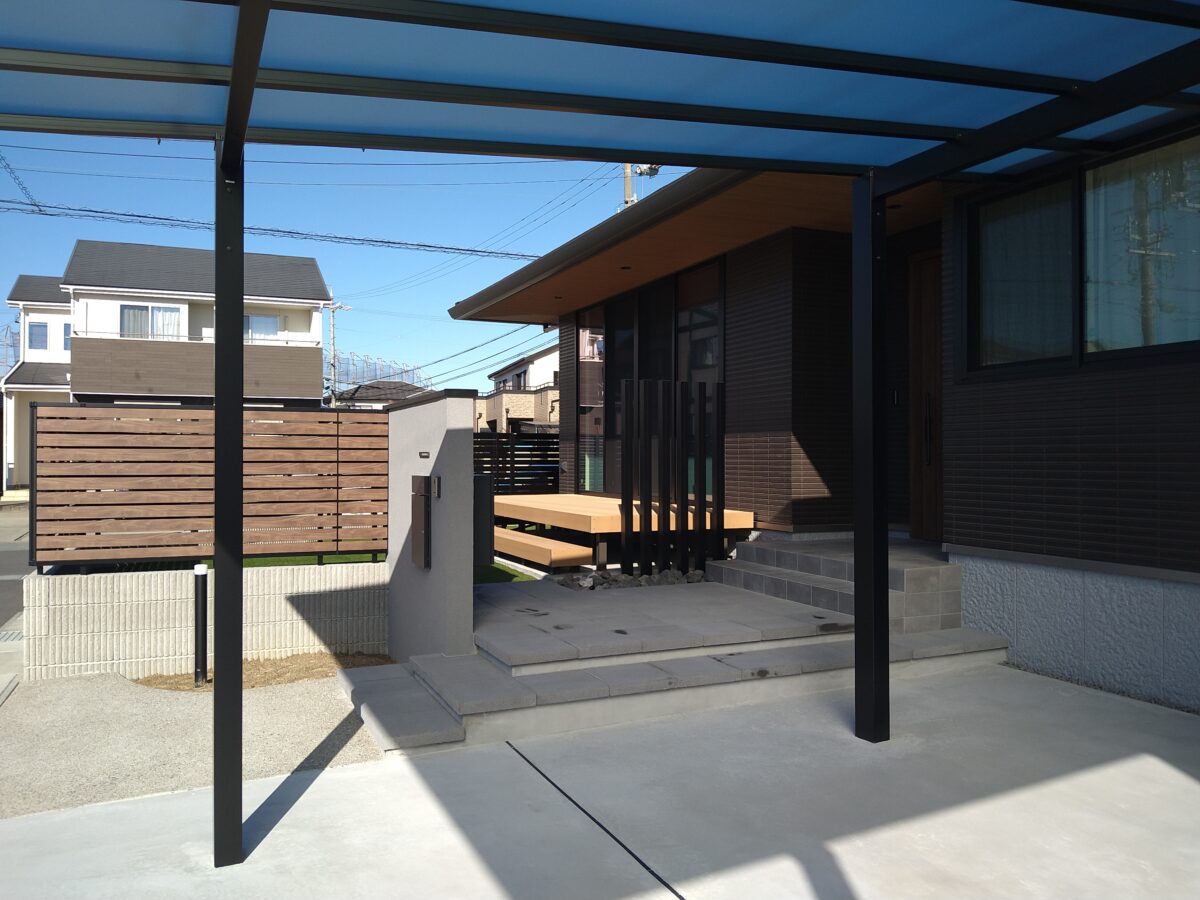 「平屋に合わせた落ち着いた外構になり、とても満足しています。ワイドなカーポートは雨の日の荷物運びにも便利で、付けて本当に良かったです。目隠しフェンスのおかげで、庭で子供と遊んでいても周囲の視線が気にならず、家族で過ごす時間が増えました!」